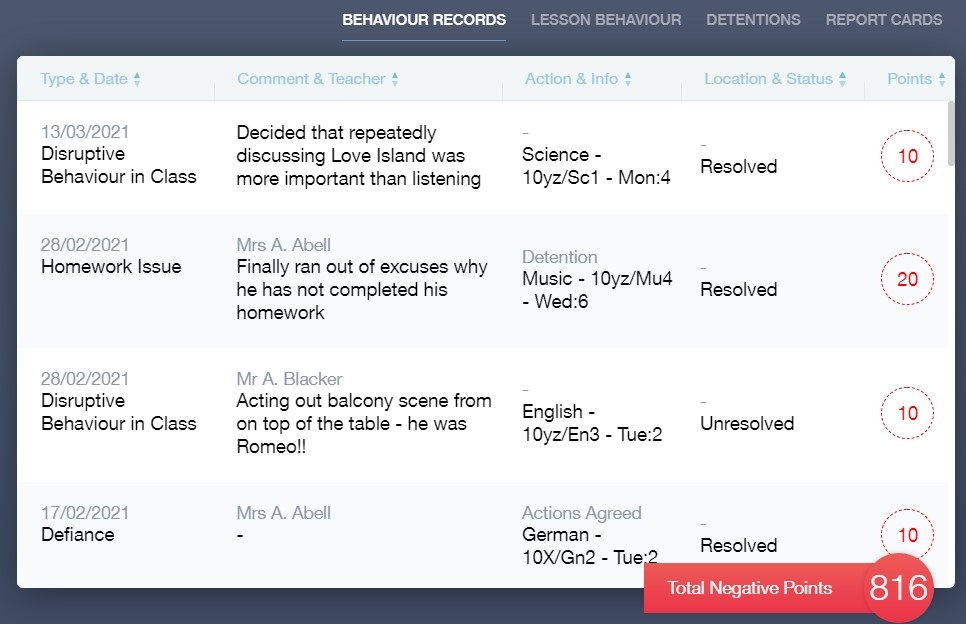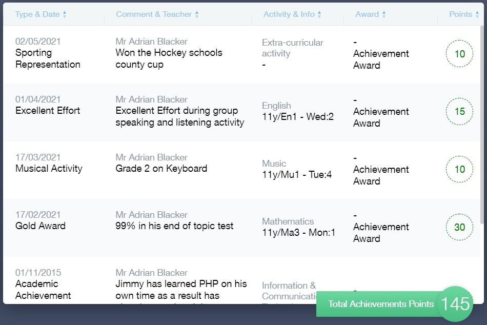 This section is where you can view information on positive achievements that have been awarded to your child. Very similar to the behaviour section, you are able to see who awarded the points and the reason for the award.