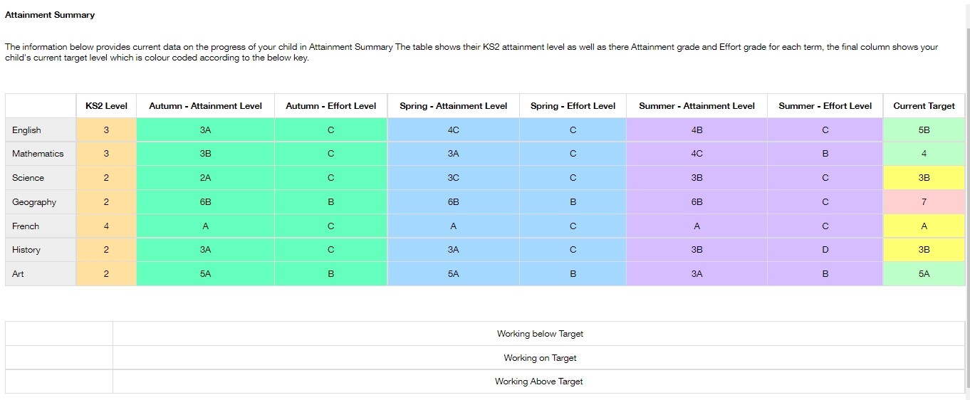 You can see your child's/children's grades, targets, attitude to learning and other aspects that the school wants parents to see in Assessments. Some schools colour code data to tell you if your child is working at the expected level. Many schools also provide a written explanation about the assessment, like what each effort grade means.
