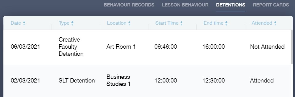 The detentions tab will show you any detentions which have been assigned to your child, including the date, start and finish times, the location and whether your child has attended.