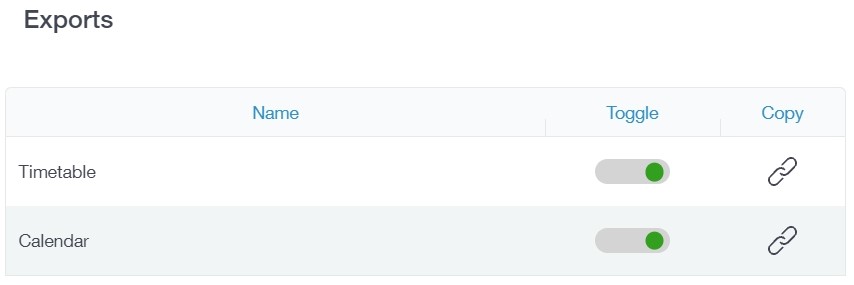 In Exports, you can export your child's Timetable and school Calendar. To do this, press on the 'toggle' to turn on the export and then copy the link