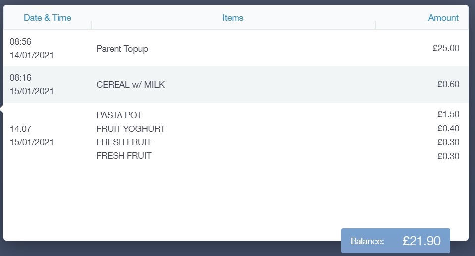 Here you can check the remaining balance of your child's school cashless catering account. Details of purchased items from the canteen are also broken down into a list including dates and times so you can see what your child has purchased each day.