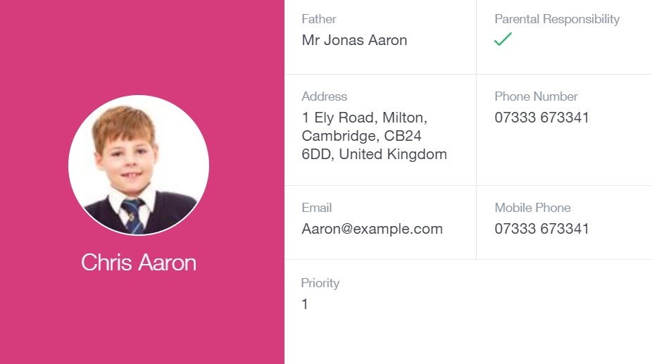 This section contains parent contact information. Details on telephone and mobile numbers, email, address, and parental responsibility can be viewed here.