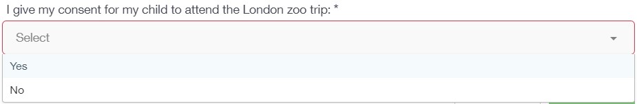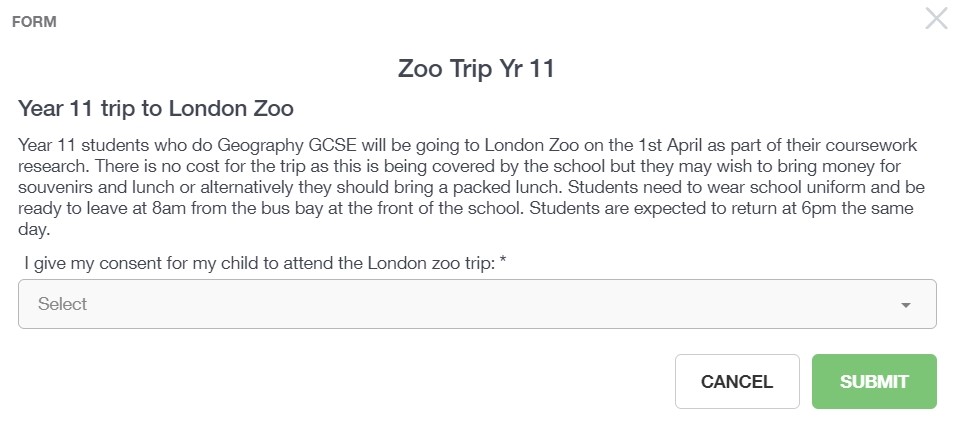 You can fill out a form sent by the school in the Forms icon. Schools will send out forms for many reasons: school trips, meal selection, permission forms etc...