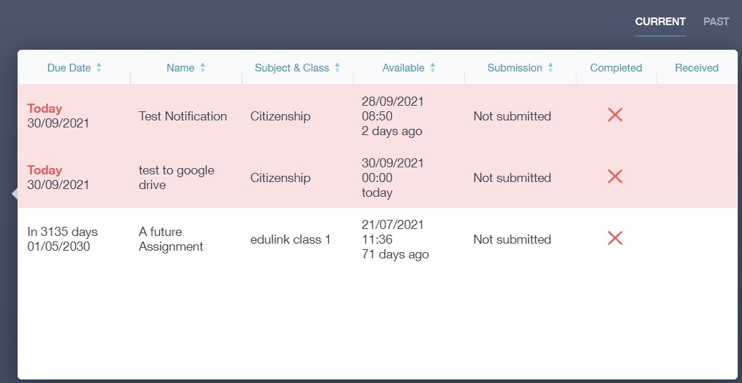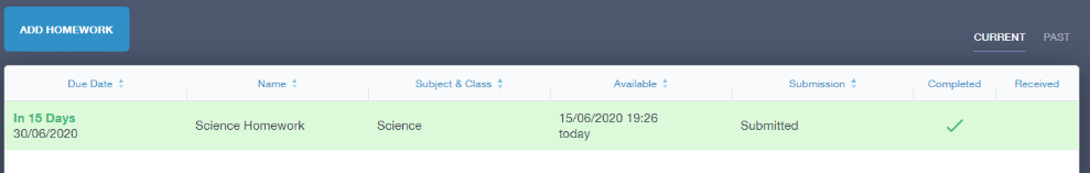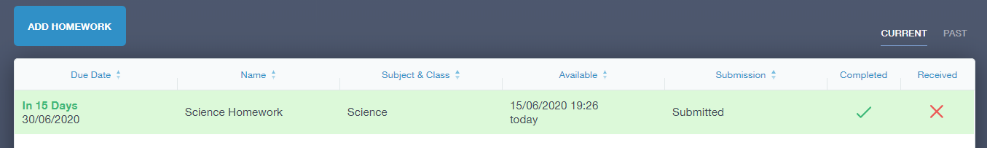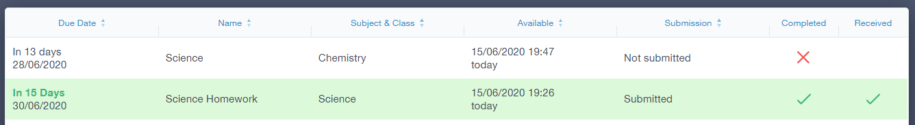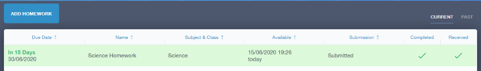 If the teacher is happy with the completed work, they will mark the work as completed and it will appear with a green check in the received column.