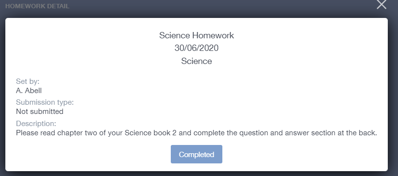 Once the student has completed the homework assignment, they should click the Completed button to notify their teacher the work has been done. It is important to note that parents can only view set homework.