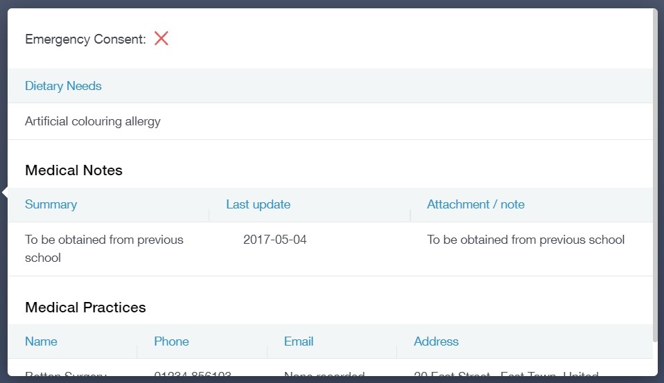 This section contains medical information that you have supplied to the school regarding your child. Details on medical conditions, medical notes, medical practices, and medical events such as appointments can all be viewed here. Allergy lists and other attachments can be downloaded in PDF format.