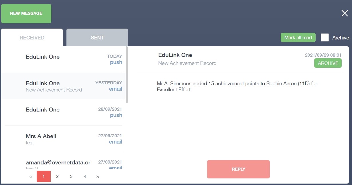 In the example below, the received tab is where any messages sent to you from the school will be. You have the option to read and reply from here. The sent box will store messages you've sent through previously.
