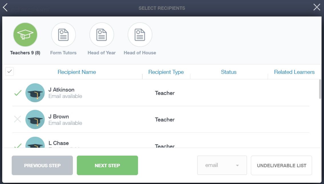 The default option is to pre-select all teachers. You can see this below as each teacher has a green tick beside. This means if you send a message now, it would go to all the selected teachers. To deselect specific teachers, just click on the green tick or deselect all using the smaller black tick. Click Next when done.