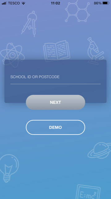 If you are using the mobile app you will see the screen to the left. You must input your School ID or Postcode and click the Next button to continue.