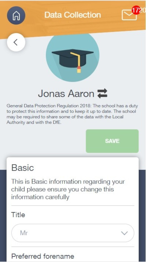 To update information using the Edulink One app on a mobile phone, click on the Data Collection/Update Information icon and the screen will open.