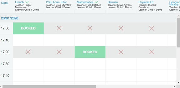 After clicking on the parents' evening event, a new window will open where you can book appointments with all your child's teachers. Free spaces appear as white, booked, or blocked spaces appear as grey with a red X, and spaces you have already booked appear in green.