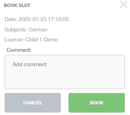 Once you have clicked on a free white space for the subject/ teacher column and the time slot column, then a new book slot window opens. It details the date and time of the booking slot, the subject you are booking for and the child you are booking for. At this time, you can also add a comment, for example, if there is something in particular you would like to discuss with the teacher.