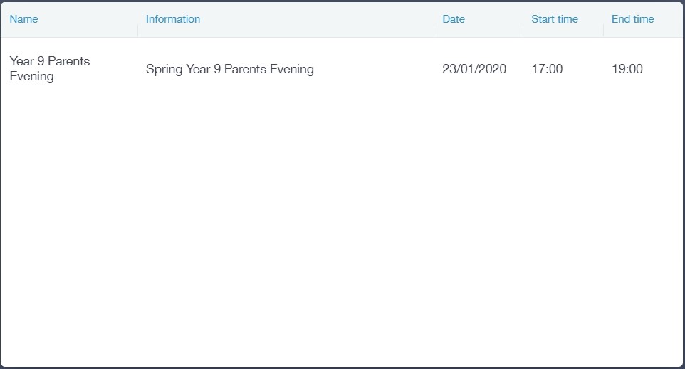 The parents' evening area in Edulink One allows parents to see the details about a parents' evening and to book appointments.