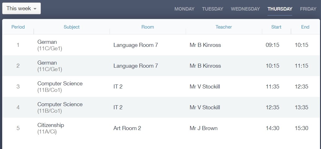 Parents and students both have access to this section, which allows you to view your child's school timetable. This shows you information on what lessons your child has each day and who the teachers are for those lessons.