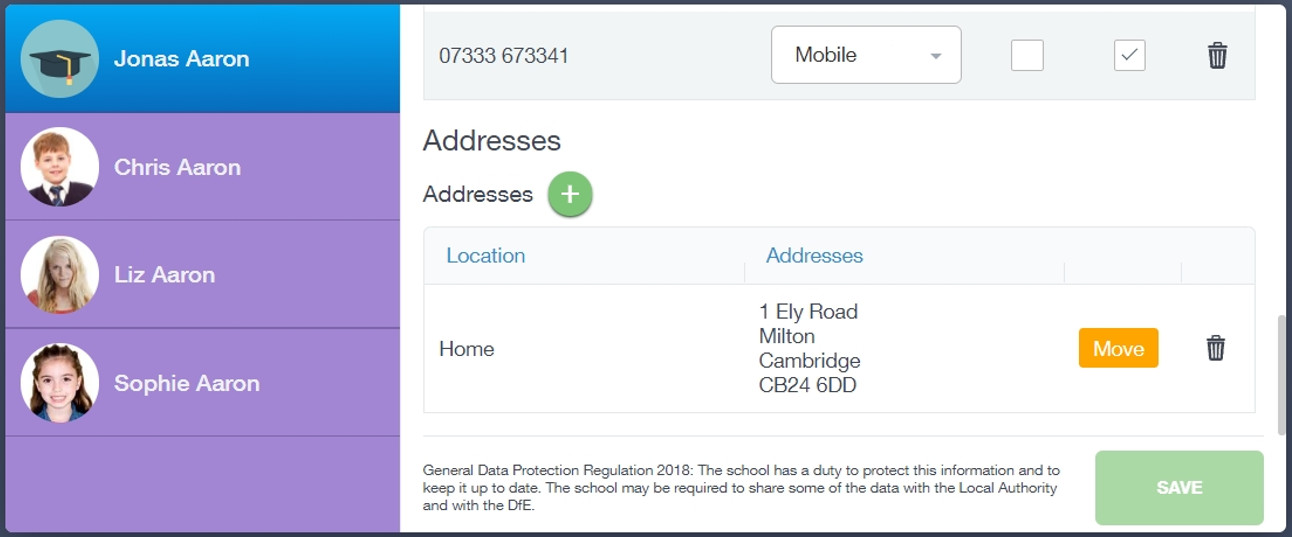 This section shows you the contact information that the school has on record for yourself and your children. Here you can review the contact information the school holds for you, but you will also be able to update this with any changes that may occur to this information. When updated information is submitted through Edulink One, this will be picked up by the designated personnel in school in charge of updating records. It will be checked by them and approved.